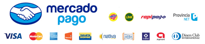 Aceptamos las principales Tarjetas de Crédito y tarjetas de débito del mercado. Pagando en 1, 2, 3, 6 o 12 cuotas, ahora también podes pagar con MercadoPago.